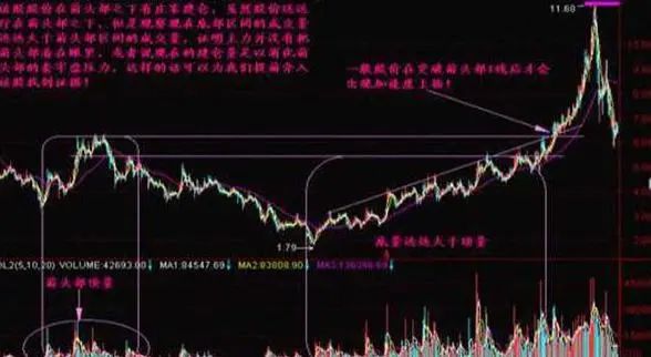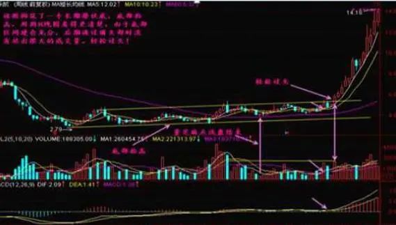 图形特征:(1)股价在冲过前一头部时放出巨大的成交量。(2)有时是单根巨大阳线,有时是温和放量的几根阳线,总之在冲过前头部时有成交量的配合。