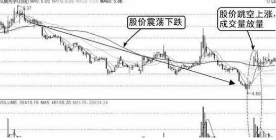 由图中可知,股价从高位震荡下跌,成交量此时并未放大,而是保持地量水平,说明股价下跌没有多少接盘,市场普遍不看多。股价两次成功探底后开始展开拉升的行情,到达一定高度后出现跳空上涨,成交量放大,如下图所示。