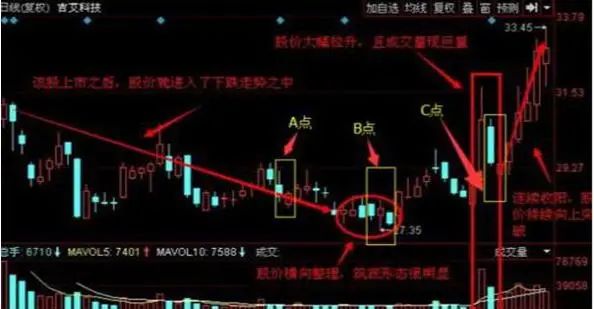 (2)最低点B点是可遇不可求的,底部的特点就是成交量少,而最低点的成交量又少之又少;