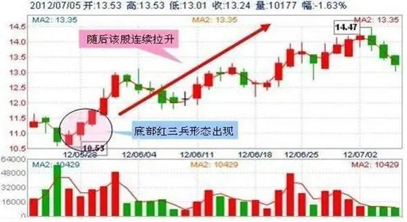 3、“底部红三兵”。此种K线组合由下跌末期的三根小阳线构成:1、每日的收盘价高于前一日的收盘价;2、每日的开盘价在前一日阳线的实体之内;3、每日的收盘价在当日的最高点或接近最高点。“红三兵”是一种很常见的K线组合,这种K线组合在下跌趋势中出现时,一般是市场的强烈反转信号。先于大盘企稳并出现“底部红三兵”走势的个股尤其值得我们注意,这通常是主力提前进场的重要信号之一。