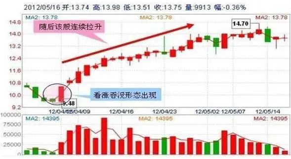 1、看涨吞没形态必须由2条K线组成,其中第二条K线的实体必须覆盖第一条K线的实体(但不一定需要吞没第一条的上下影线);