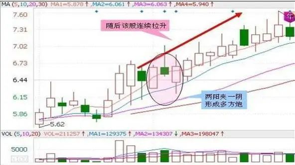 1、“多方炮”。此K线组合上呈现两阳夹一阴的形态,还有以此演变出来的一种三阳夹二阴的图形,戏称为叠叠多方炮。1、第一根放量的阳线要具有突破性的意义;2、第二根出现的阴线,成交量必须急速的萎缩,而股价不可以再回到被突破的均线或压力线之下,说明突破的有效性,阳线后走出阴线只是一次良性的洗盘;3、第三根阳线的收盘价,理应高于第一根阳线的收盘价,而且后一根阳线比前一根阳线又有温和的放量,但也不能放出巨量。