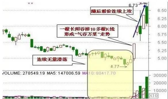 14、“气吞万里”。股价在低档持续小幅无量滑落,某一日正常开盘后拔地而起,报收大洋心啊,统吃此前近10根K线,成交量亦放出巨量。此K线组合往往是受某些突发性消息的刺激,主力机构匆匆忙忙拉高建仓的表现。由于此巨量长阳来势凶猛,一举扭转颓势,正如古诗所言“金戈铁马,气吞万里如虎”,故称“气吞万里”。