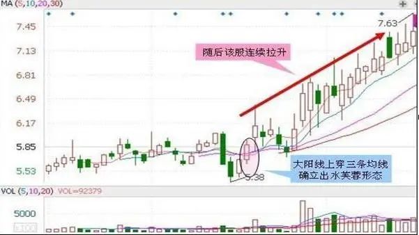 2、“出水芙蓉”。此K线形态也是一根大阳线,但是这根大阳线上穿三条均线,使均线呈现多头排列形态,后势极端看涨。三条均线指5日10日20日,这是一个中期或波段式的上涨行情,缩量回调是买进时机。1、K线实体要大,尾盘分时不能有急跌;2、长阳上穿3条均线;3、若有过倍巨量则长阳后有回调。