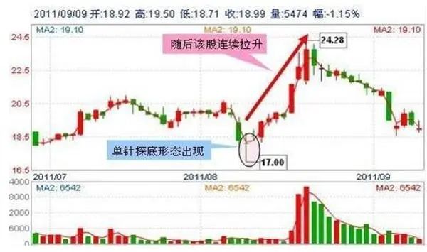 4、“单针探底”。此K线图较为常见底部反转形态图表之一。这种形态由单根带长下影线的K线(阳线或阴线)组成,此形态出现在下降趋势中,是下降趋势可能即将结束的信号,它经常发生在一段下跌行情的底部。这时候通常表明空方力量衰竭,很多卖家已不认可价格会继续下跌而惜售,新买家也认为市场可能超跌,脱离了价值估值,终于下定决心准备入市,市场逐渐向多方倾斜。