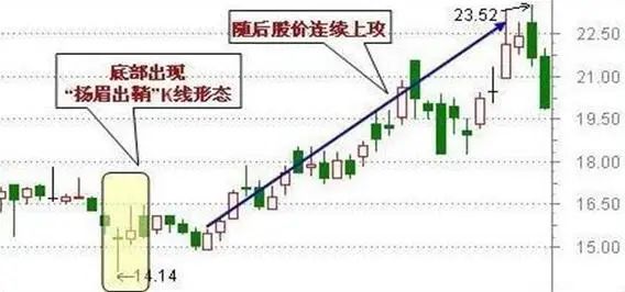 12、“扬眉出鞘”。股价深幅下挫,在低档收出大中阴线,次日向下跳空拉出一根长下影线,表示在低档已经有主力大量接盘,支撑十分强劲,多为买入信号,预示后市将反弹。第三日若开出高盘,则可视为反弹开始。此K线组合的上下影线前后皆无遮拦,犹如宝剑已经出鞘,即将斩妖伏魔,故称“扬眉出鞘”。