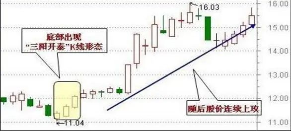 13、“三阳开泰”。股价在低档经过较长时间的整理之后,连续走出三根小阳线,形成“红三兵”走势,这是一波行情启动的信号。此K线组合的三根小阳线的收盘价逐日向上移动,且多半属于当天的较高价格为,武士勇往直前的形象跃然纸上,底部趋升的形式甚为明显,故称“三阳开泰”。