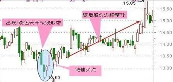 11、“金鸡报晓”。在连续下挫行情中,股价在低位收出大阴,空方大获全胜。次日却被多头打个措手不及,以高价开盘并最终红盘报收。此K线组由阴孕阳构成,犹如雨后虽然乌云满天,却已遮不住太阳的光芒,正所谓“晓色云开,春随人意,骤雨才过还晴”,故称“晓色云开”。