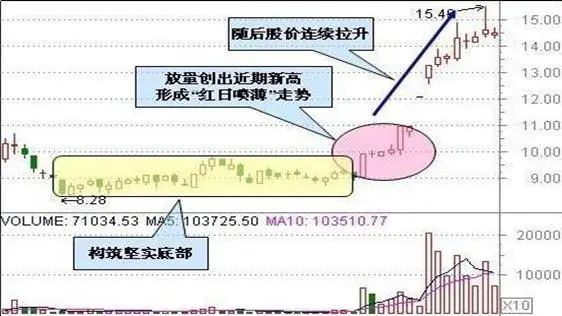 15、“红日喷薄”。股价经长时间横盘整理后,底部已经构筑得十分坚实,向上突破只是时机问题。果然,某一日股价被放量拉抬,以长阳报收,创出近期新高。从图形上来看,其前的横盘区域价位相差无几,犹如地平线一样,而带量长阳犹如一轮红日从海面上喷薄而出,故称“红日喷薄”。该K线形态是低档长期盘整后的突破信号,预示后市股价将大涨。