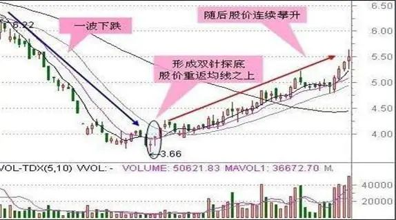 9、“双针探底”。股价在前期放量上涨后,缩量回调,在大均线附近出现两次下影K线组合,谓之双针探底,一旦股价重返短期均线上方,往往将转入急攻行情,所以在第二次出现下影十字星线的大均线附近是较佳低吸点。