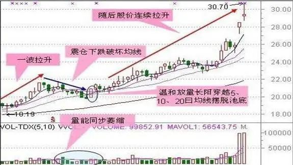 10、“池底巨龙”。前期放量上涨之后出现破坏均线的震仓动作,成交量连续萎缩,与前期量比呈芝麻点,后温和放量发力穿越5、10、20曰均线摆脱池底,随后回落20曰均线,此时为最佳的低吸点,后市有望发动中级反弹行情。
