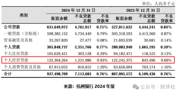 特别是个人经营性贷款方面,自2020年后银行业大量发放此类贷款,但实际上不少借款人将其用于购房,这直接导致了当前银行业普遍面临的资产质量压力。年报数据显示,从2019年末至2024年末,杭州银行贷款和垫款总额增长了126.4%,而同期个人贷款总额增长了92.7%。尤其值得注意的是,个人经营贷从549.3亿元激增至1323亿元,增幅达到了140.8%,其增速远超整体贷款增速和个人住房贷款增速,成为推动个人贷款增长的主要动力源。然而,在2023年末至2024年末期间,个人经营贷的不良率从0.69%升至0.93%,不良贷款金额由8.43亿元增至12.32亿元,这一数字超过了房贷和消费贷不良贷款之和,成为个人贷款业务中的主要风险点。
