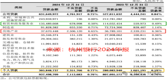仅次于房地产的另一大风险资产来源是个人业务。截至2024年,杭州银行个人贷款同比增长超过9%,然而不良贷款迅速增加。到2024年末,杭州银行个人贷款不良总额达到23.51亿元,相较于2023年末的16.65亿元增长了41.2%;个人贷款不良率从0.59%上升至0.77%,增幅超过了三成,显示出不良率与不良规模双双快速攀升的严峻态势。
