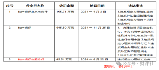 在此之前,杭州银行也多次因外汇业务违规受到处罚。例如,2023年11月,杭州银行舟山分行由于未能按规定报送财务会计报告和统计报表等资料,受到了国家外汇管理局12万元罚款及警告的处罚;2024年4月,外汇管理局北京市分局公告指出,杭州银行北京分行涉及违规办理结汇业务、违反外汇登记管理规定及资本项目资金收付等问题,最终被罚没合计105.7万元;同年8月,杭州银行合肥分行因违反规定办理结汇业务,被外汇管理局安徽分局处以45.5万元罚款。