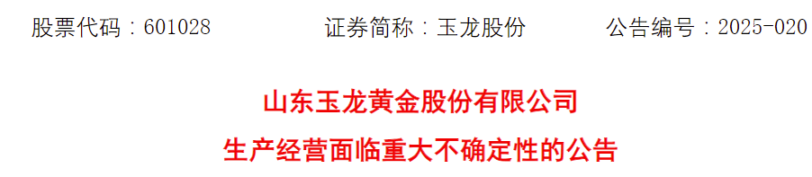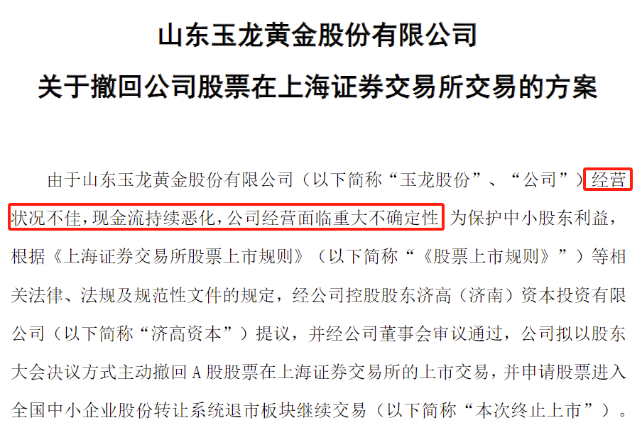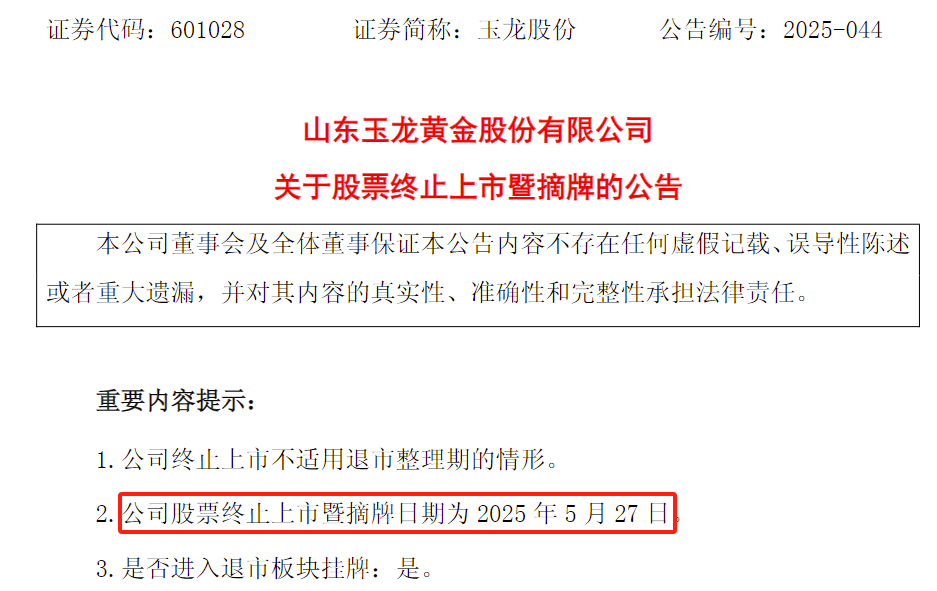 2025年5月20日,玉龙股份收到上海证券交易所作出的《关于山东玉龙黄金股份有限公司股票终止上市的决定》,上交所决定终止公司股票上市。公司股票不进入退市整理期交易,上交所将在公告公司股票终止上市决定之日起5个交易日内,对公司股票予以摘牌、终止上市。