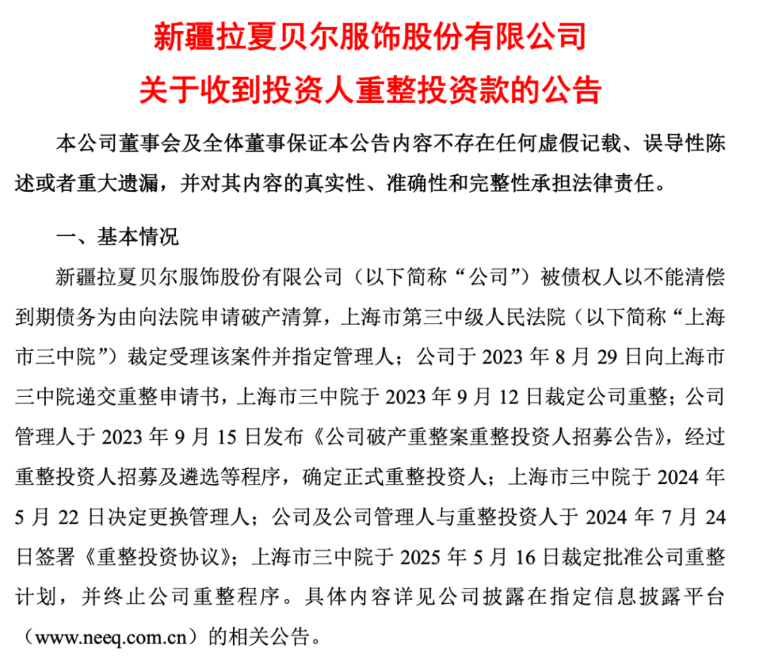 5月16日,拉夏贝尔发布公告,宣布上海市第三中级人民法院裁定批准公司重整计划。5月23日,拉夏贝尔再发公告披露重整最新进展。