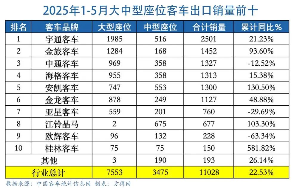传统客车强企主力阵容——大中型座位客车,2025年1-5月出口11028辆、同比增长22.53%。其中5月大中型座位客车共计出口2299辆、同比增长8.96%。