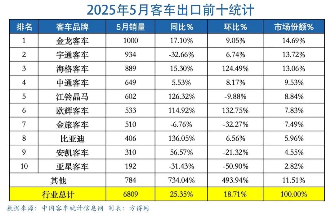 2025年5月出口客车(车长3.5米以上)6809辆,同比增长25.35%、环比转正18.71%!
