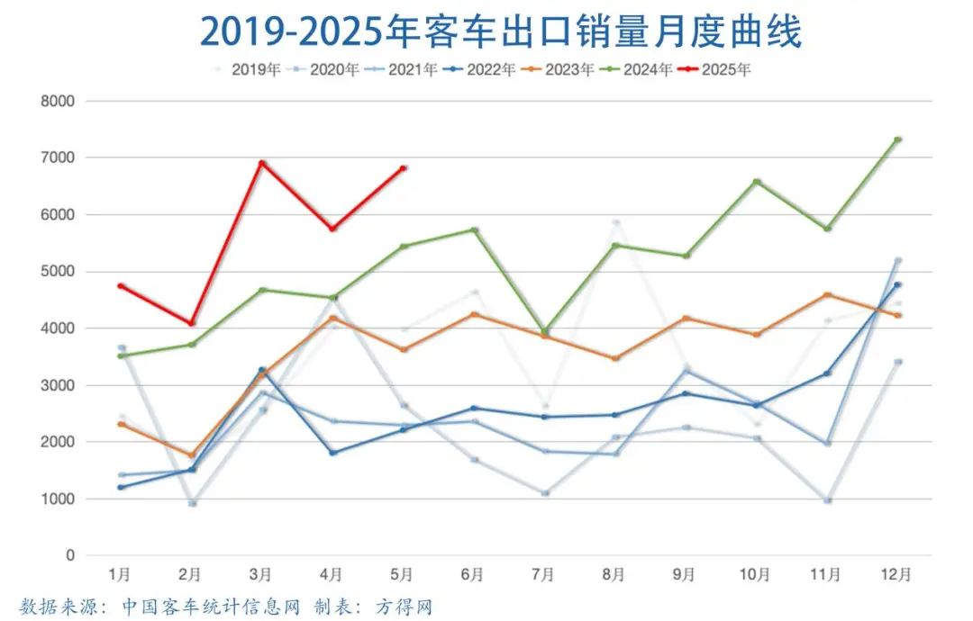 2025年5月客车出口6809辆,不仅是5月出口历史新高,排在7年来单月出口成绩第三,显示出强势反弹气势。
