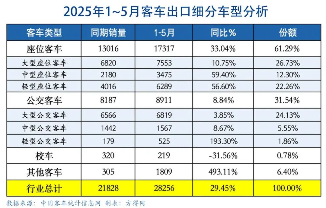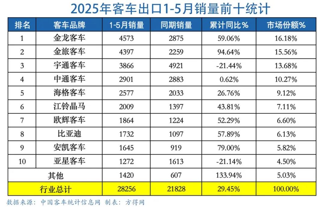 2025年1~5月,客车出口销量28256辆、累计同比增长29.45%!5个月时间累计出口已接近3万辆!