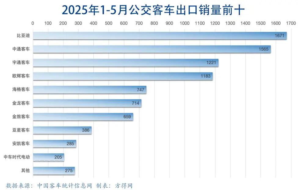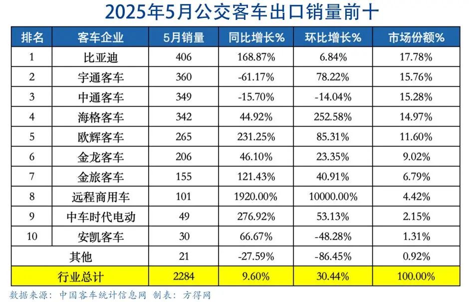 2025年5月,公交客车出口2284辆,环比大涨30.44%、同比小增9.60%。行业前十再生颠覆变化!