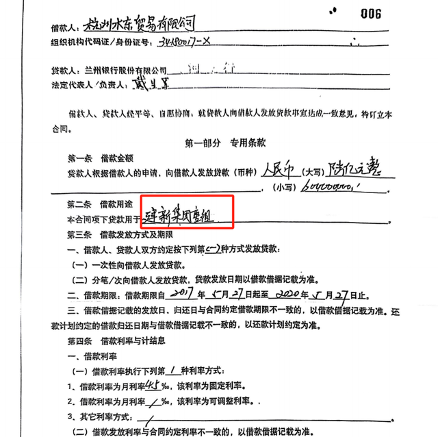 兰州银行当时发放的这11亿元贷款,至少部分用于建新矿业重整。根据贷款合同内容,杭州木东的6亿贷款,就明确约定了资金用途,是用于建新集团重组。