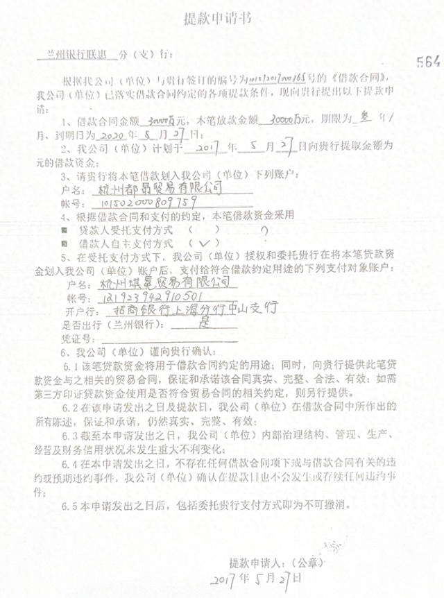 同样是在2017年5月27日,兰州银行及其分支机构还向另两外家杭州“迷你”贸易公司,发放了两笔贷款,金额分别为6亿元、3亿元。