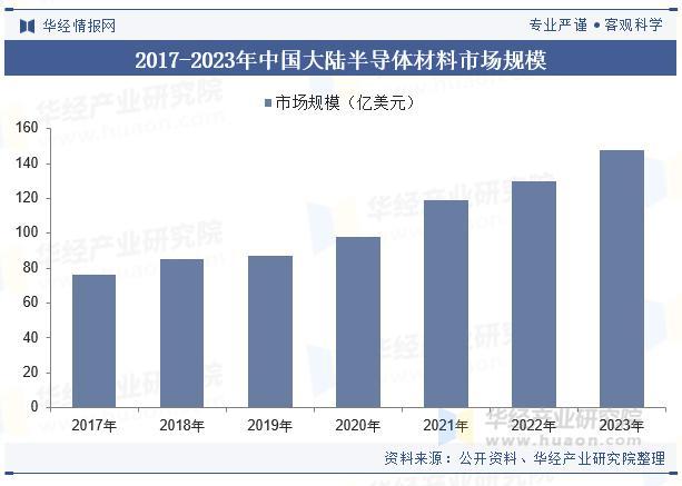 全球半导体材料市场规模呈现稳步增长态势,从2017年469亿美元增长至2023年的794亿美元,年复合增长率为9.1%。中国大陆半导体材料市场规模也在快速增长,从2017年为76亿美元增长至2023年的148.2亿美元,年复合增长率为11.74%,增速远超全球半导体材料市场。