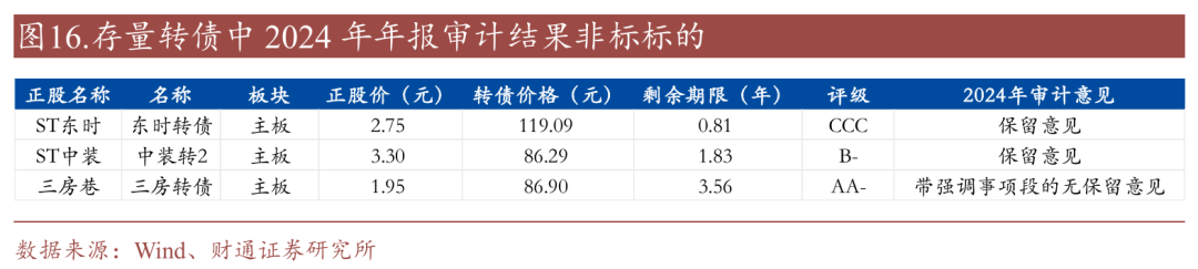 此外若年报被出具无法保留意见/否定意见同样面临风险警示和退市,目前转债暂无相关标的。从边际风险来看, 3只转债(ST东时、ST中装、三房巷)2024年年报审计意见为非标意见。若上述个券2025年年报获无法表示意见或否定意见,将被实施退市风险警示或直接退市。