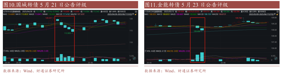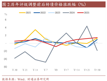 2024年转债评级调整数量和影响显著增加。复盘历史转债评级调整行情,2024年评级调整数量和影响较大,彼时市场出现多重信用风险冲击,4月12日“国九条”出台、弱资质个券出现风险(普利未按时发布年报、岭南公告存在赎回风险)、三房等评级超预期调整、多只破面转债出现减资清偿和回售压力,此外山鹰下半年也面临较强的到期兑付压力,引发市场对转债违约风险的进一步担忧。