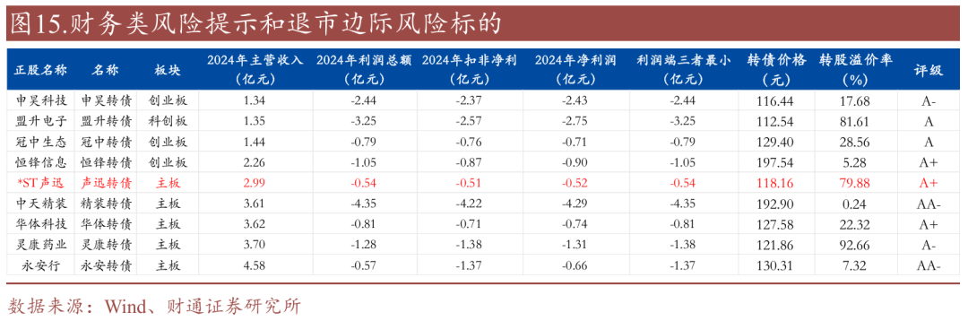 基于存量转债2024年年报数据,声迅股份因主营不足3亿,利润端三者较低的数据为负被被出示信用风险警示变成*ST声迅,此外主板/创业板/科创板暂无转债触及下述财务类退市指标。从边际风险来看,我们筛选利润总额、净利润和扣非净利三者较低者为负且主板营收低于5亿元、创业板科创板营收低于3亿元的标的,建议关注冠中、申昊、恒锋、盟升、*ST声迅、精装、华体、灵康、永安2025年的财务风险警示和退市风险。净资产角度暂无风险,目前市场所有者权益规模最小的为文科转债(2.46亿元)。