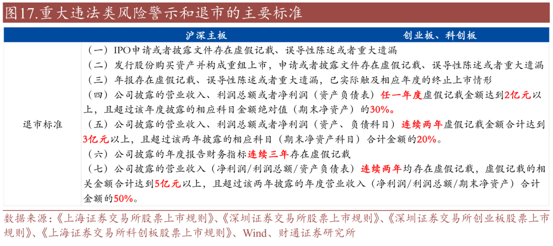 财务类风险警示及退市标准中,公司最近一个会计年度经审计的利润总额、净利润、 扣除非经常性损益后的净利润三者孰低为负值,且扣除后的营业收入低于 3 亿元(沪深主板3亿元,创业板/科创板1亿元)或期末净资产为负以及若有年报被出具无法表示意见或者否定意见的审计报告则会被风险警示,连续2年将实施退市。此外科创板对于研发型上市企业的风险提示要求和退市标准与沪深主板和创业板细则略有不同。