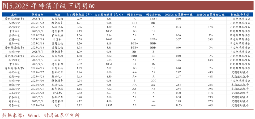 剔除频繁下调评级的东时、普利、中装转债,2025年目前共有5只转债不定期下调评级,8只转债定期下调评级,其中6只从A+下调为A(瑞科、雪榕、华宏、富淼、山石、蒙泰),2只从AA-下调为A+(裕兴、国城),2只从AA下调为AA-(金能、闻泰),1只从A下调至A-(冠中)、1只从A-下调为BBB+(宏图),1只从BBB+下调为BBB-(塞力)。评级下调转债中公募2025Q1持仓占比较高的有华宏、裕兴、富淼、国城、闻泰,评级相对较高的是裕兴、金能、国城和闻泰。