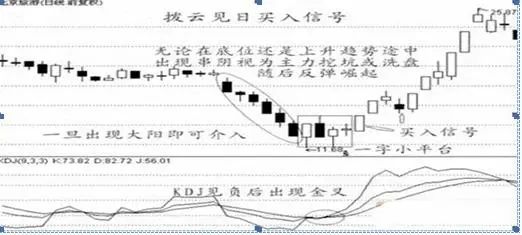 图解小结:股价在箱体盘整后或者是上涨后洗盘出现急速大阴或串阴线下探10%以上,同时KDJ、CCI见负值,超卖现象。