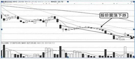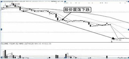 由图中可知,股价在前期25.36元处见顶,随之股价表现得极度弱势,连续收出阴线并呈斜坡式的下跌,随后股价在低位进行横盘数日。横盘结束后,股价出现跳空阴跌,同时成交量放大,后市走势如下图所示。