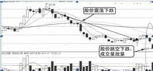 由图中可知,该股在经过跳空下跌后股价继续下滑,成交量间断放大,股价收出多根小阴星和小阴线。若投资者遇此情况应及时在股价跌势放缓时出局。