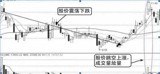 由图中可知,股价从高位震荡下跌,成交量此时并未放大,而是保持地量水平,说明股价下跌没有多少接盘,市场普遍不看多。股价两次成功探底后开始展开拉升的行情,到达一定高度后出现跳空上涨,成交量放大,如下图所示。