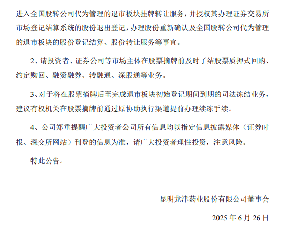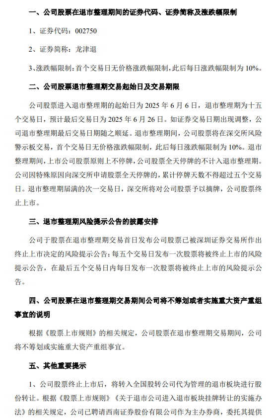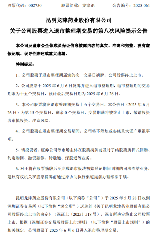 【退市整理】龙津退:关于公司股票进入退市整理期交易的第八次风险提示公告