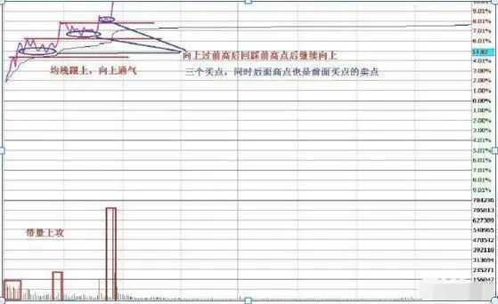 向上过前高后回踩前高点后继续向上,均线跟上(带量上攻)