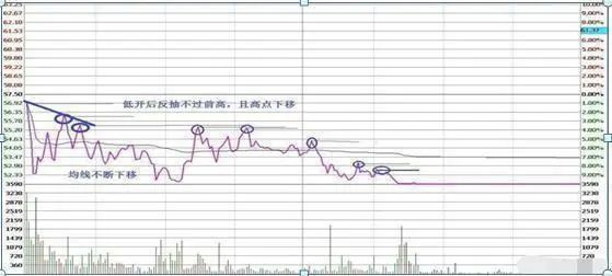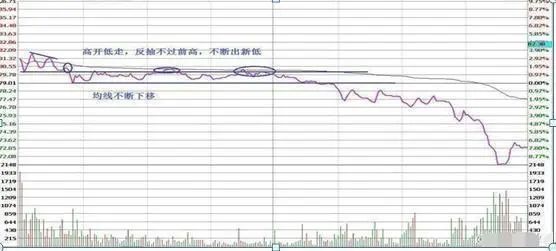 低开后反抽不过前高且高点下移,均线跟下