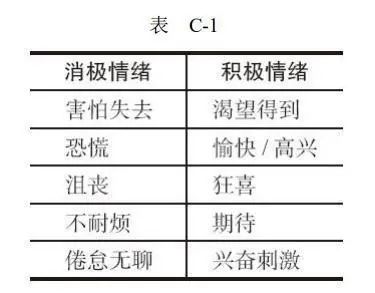 在表C-1中,我们可以看到一些在我指导交易学员过程中遇到的最常见的情绪。这是从我们每时每刻能够体验到的所有情绪中选出的个非常小的集合。虽然我在此将它们分为了消极情绪和积极情绪两类,但这并不意味着该情绪会产生理想中的行为。行为问题将会在本文后半段讨论