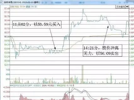 如图所示,11点02分笔者以53.59元对该股做顺向的“T+0”操作,到14点21分的时候,股价冲高无力,回落跌破右肩,果断以56.09元卖出。