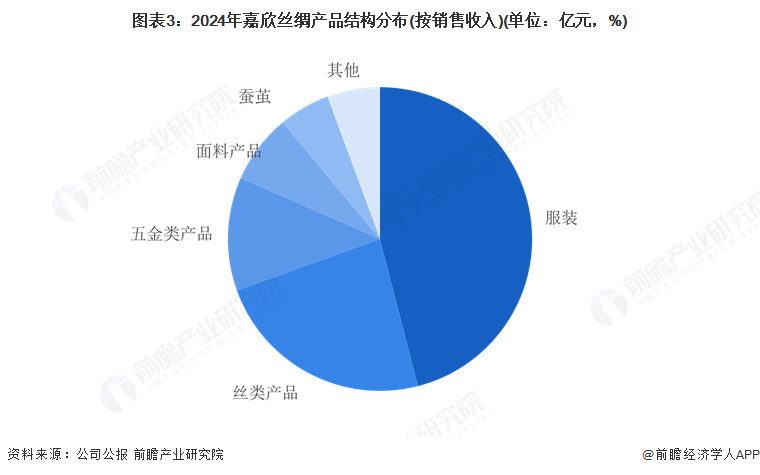 分产品来看,嘉欣丝绸收入主要来自于丝绸生产及销售,2024年公司服装业务实现营业收入21亿元,占比总营收46%;丝类产品、面料产品、蚕茧的营收规模分别为10.74亿、3.36亿和2.49亿元,丝绸业务占比总营收82.29%。