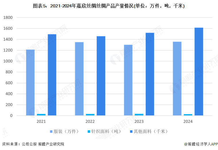 从生产规模上看,2021-2024年公司丝绸产品整体产量呈现波动变化。其中,服装产量在2022年达到峰值后略有回落,2024年再次回升;针织面料产量2023年增长显著,但2024年有所下降;其他面料产量则逐年上升,2024年达到最高。这表明公司在产品结构上进行了调整,可能在优化资源配置,以适应市场需求变化。