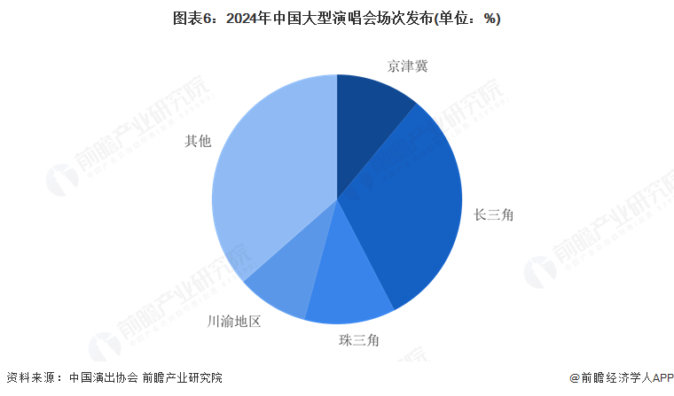 从演唱会举办地点分布上看,根据中国演出协会发布的《2024大型营业性演出市场趋势及特点分析》,大型演唱会集中举办在京津冀、长三角、珠三角、川渝等经济发达城市群,总票房产出占比全国63.5%,其中长三角地区的大型演唱会票房达31.4%。