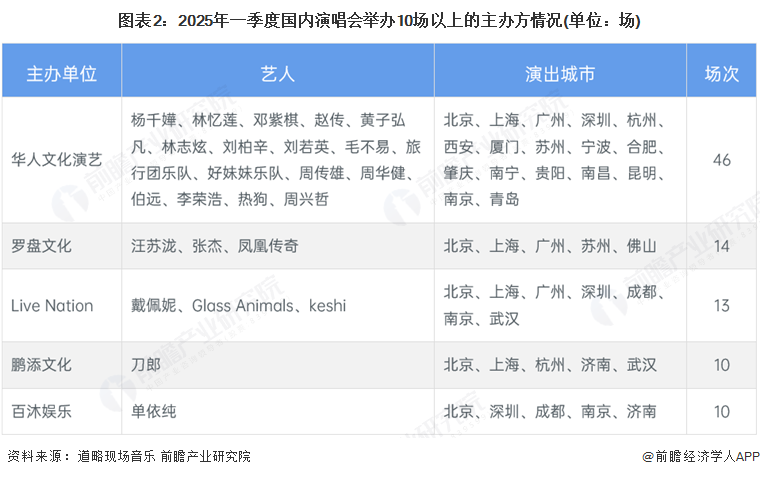从演唱会主办方竞争上看,根据道略现场音乐统计,2025年一季度有5家机构演唱会主办量达10场及以上。其中,华人文化演艺主办演出最多,主办了杨千嬅、林忆莲、邓紫棋以及毛不易等17个艺人/团体共46场演出。此外,罗盘文化、Live Nation也表现突出,各成功举办了14和13场演唱会。