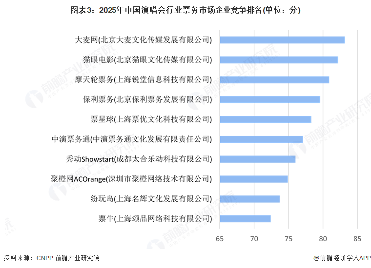 从演唱会票务平台竞争上看,2025年5月13日,十大品牌网以大数据算法、人工智能、客观真实公正统计计算为基础,通过广泛收集整理汇编全球权威资料,综合多家机构媒体和网站公布的排行榜单数据,结合专业独立的调研测评以及人为根据市场和参数条件变化的分析研究,最终基于网络投票、评价评论、点赞口碑打分等因素,公布了《2025年CNPP演出票行业十大品牌榜中榜名录》,入选品牌有:大麦网、猫眼电影、摩天轮票务、保利票务、票星球、中演票务通、秀动Showstart、聚橙网ACOrange、纷玩岛、票牛等。