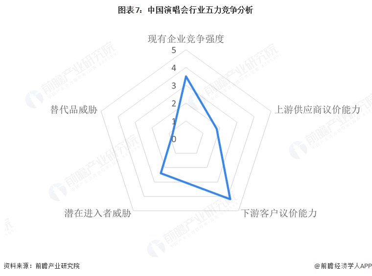根据以上分析,对各方面的竞争情况进行量化,5代表最大(竞争激烈/威胁大/议价能力强),0代表最小(竞争小/威胁小/议价能力弱),演唱会产业的竞争情况如下图所示: