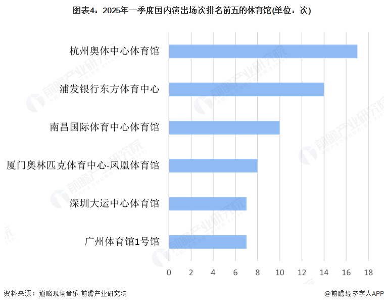 从演唱会举办场馆上看,2025年一季度,演唱会场次排名前五的体育馆共6个,其中位于杭州的杭州奥体中心体育馆演出最多,举办了6场Ed Sheeran的“+-=÷”Tour巡回演唱会;浦发银行东方体育中心演出达14场,举办了张杰、戴佩妮、CAS乐队、胡夏等歌手、乐队的巡回演出。