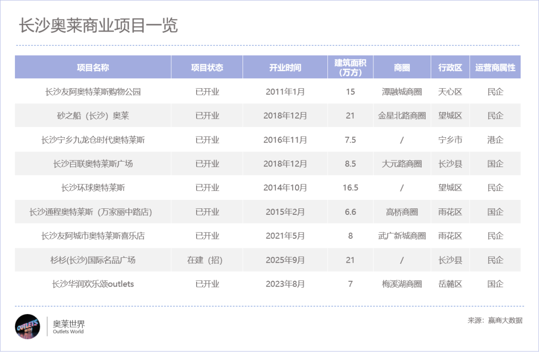 2011年1月,位于长沙、株州、湘潭三市交界的友阿奥莱购物公园(简称“长沙友阿奥莱”)试营业,建筑面积达到10万平方米,成为当时中南地区面积最大的奥特莱斯。